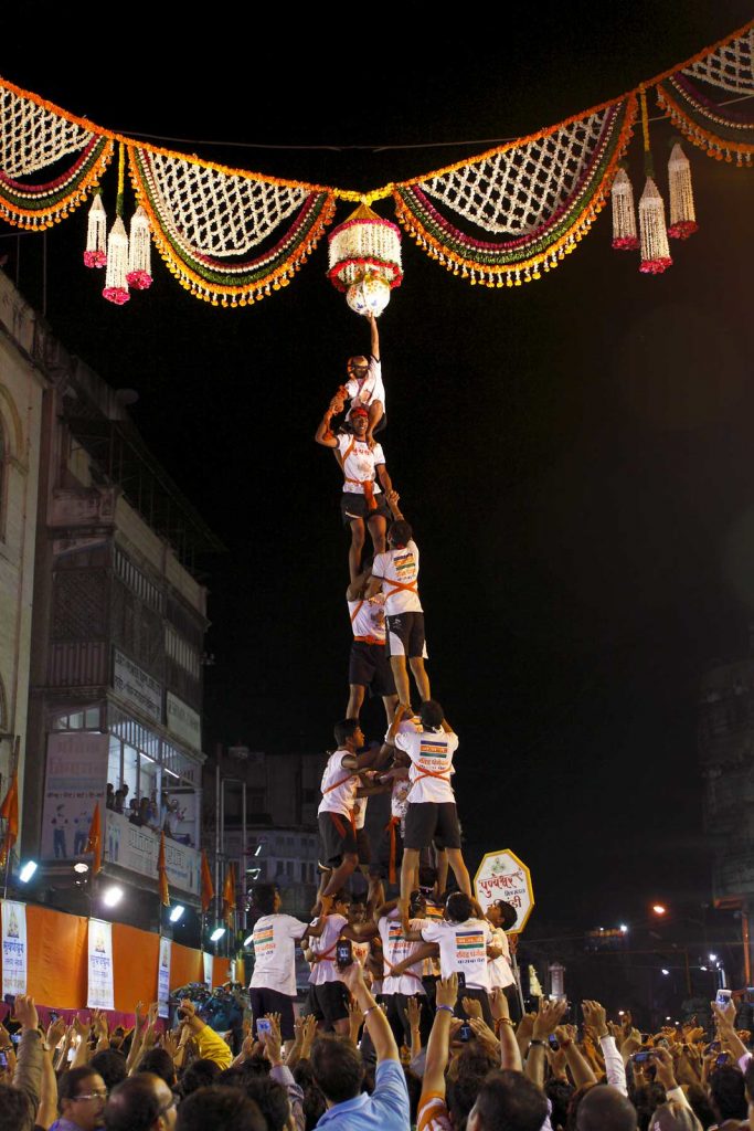 Le Janmashtami est une fête religieuse Hindoue qui célèbre  l’anniversaire de Krishna (Il est l’avatar du dieu Vishnu dans l’hindouisme). Pour l’occasion, des miliers de personnes se rassemblent dans les rues .On suspend en l’air des pots de terre cuite contenant du yaourt. Les hommes forment ensuite une pyramide humaine pour atteindre le pot suspendu et le casser. C’est souvent très impressionnant !